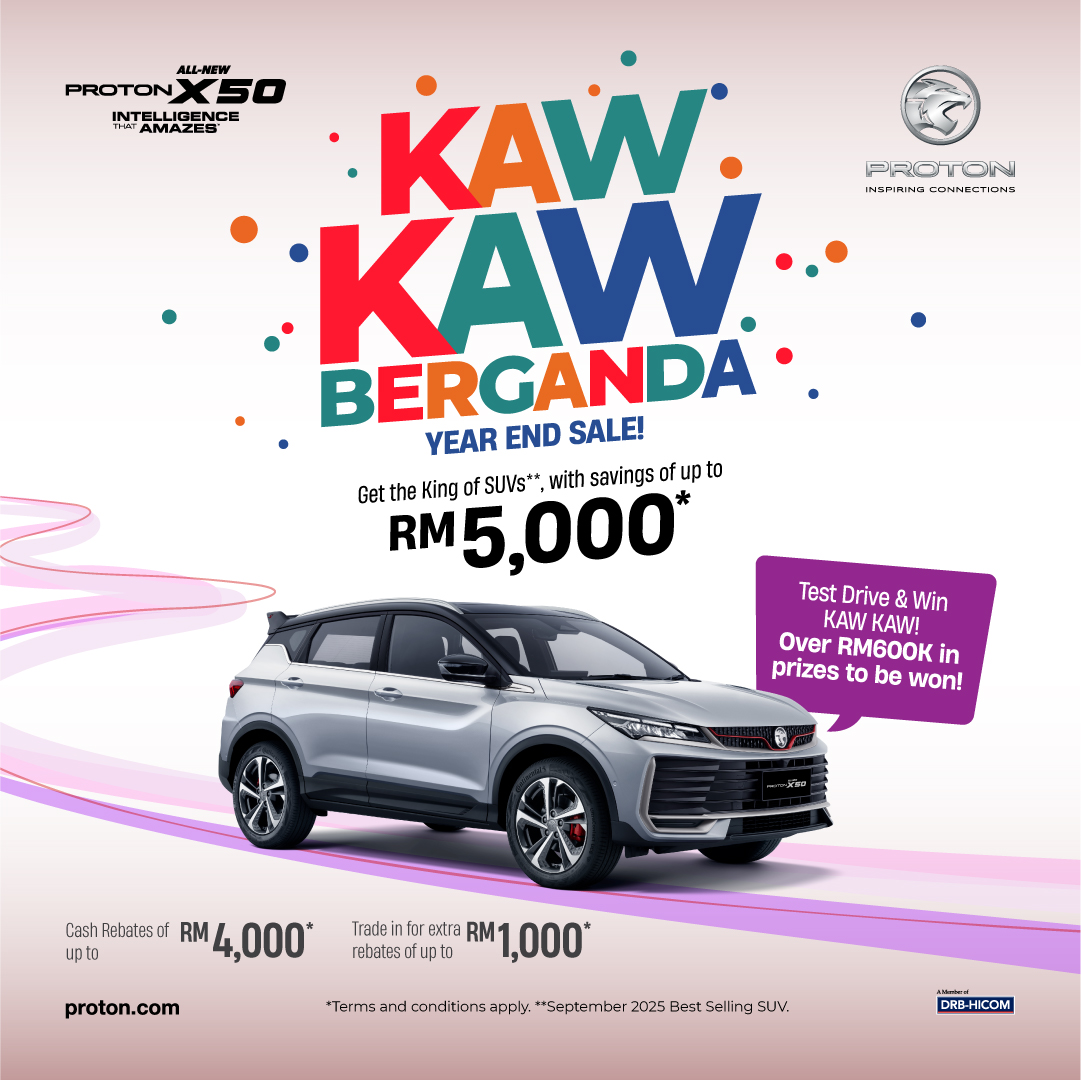 - PROTON juga menawarkan kempen Kaw Kaw Berganda! dengan rebat istimewa, hadiah bernilai RM600,000, dan trade-in rebate sehingga RM5,000 untuk pembeli X50.