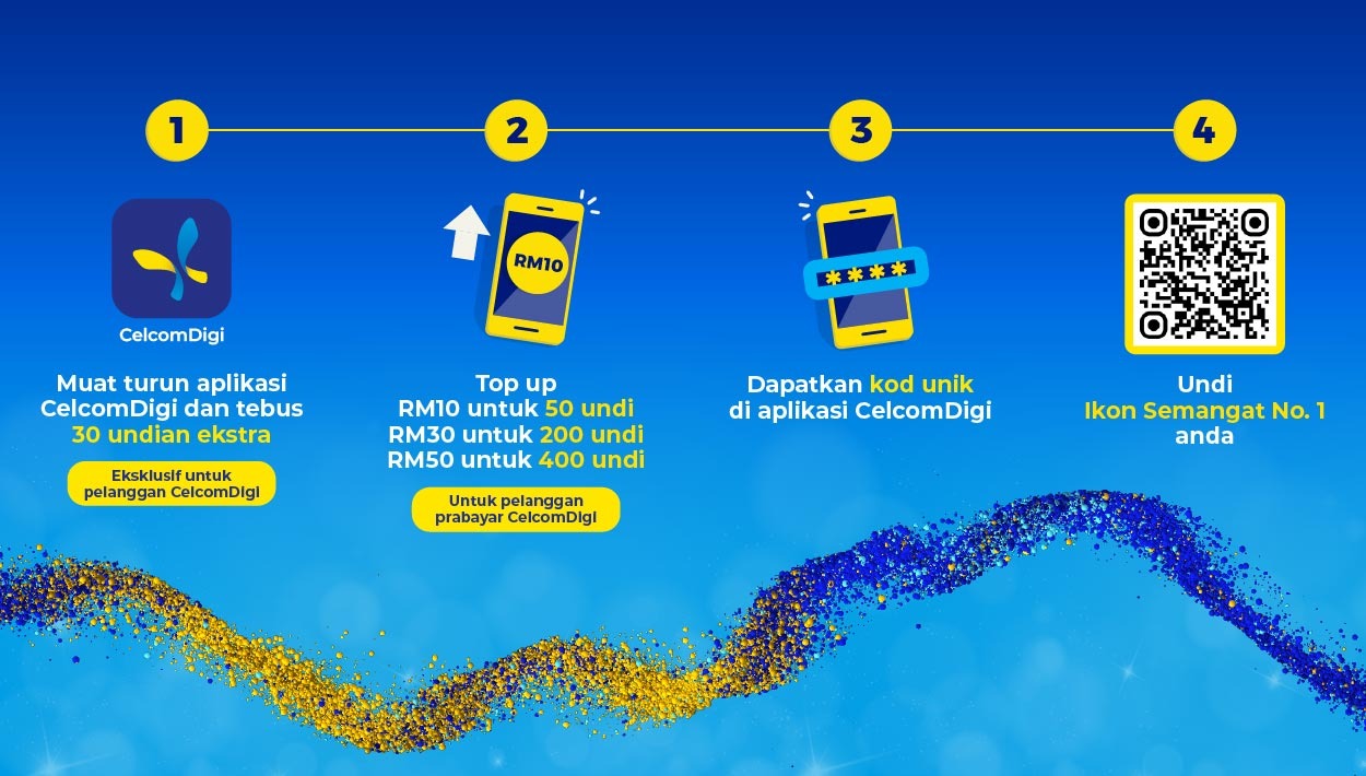 - Mahu lebih undian? Pelanggan CelcomDigi Prepaid 5G boleh tambah nilai melalui aplikasi baharu CelcomDigi untuk mendapatkan undian tambahan mengikut nilai tambah nilai. Bagi yang belum menjadi pelanggan, anda boleh mendapatkan pek CelcomDigi Prepaid 5G di CelcomDigi Online Store.