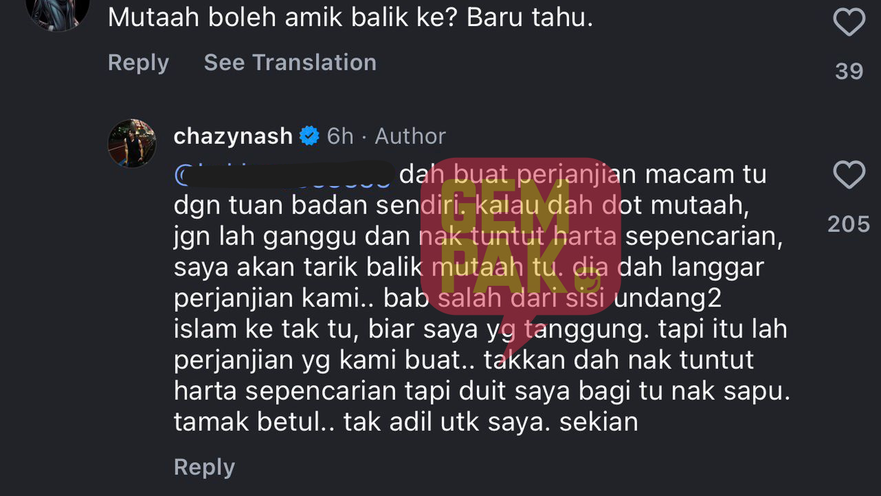 Menerusi ruang komen di Instagram, seorang wargamaya mempersoalkan tindakan Chazy yang ingin menarik semula mutaah yang diberikan kepada bekas isteri.