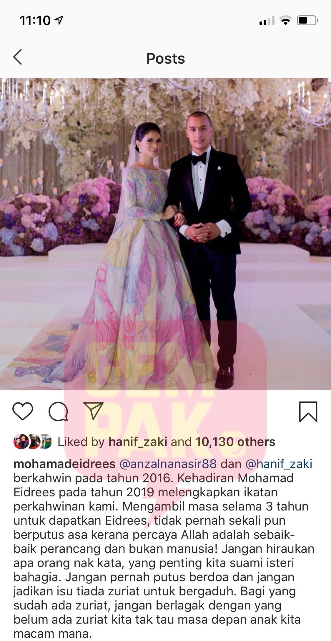 "@anzalnanasir88 dan @hanif_zaki berkahwin pada tahun 2016. Kehadiran Mohamad Eidrees pada tahun 2019 melengkapkan ikatan perkahwinan kami.