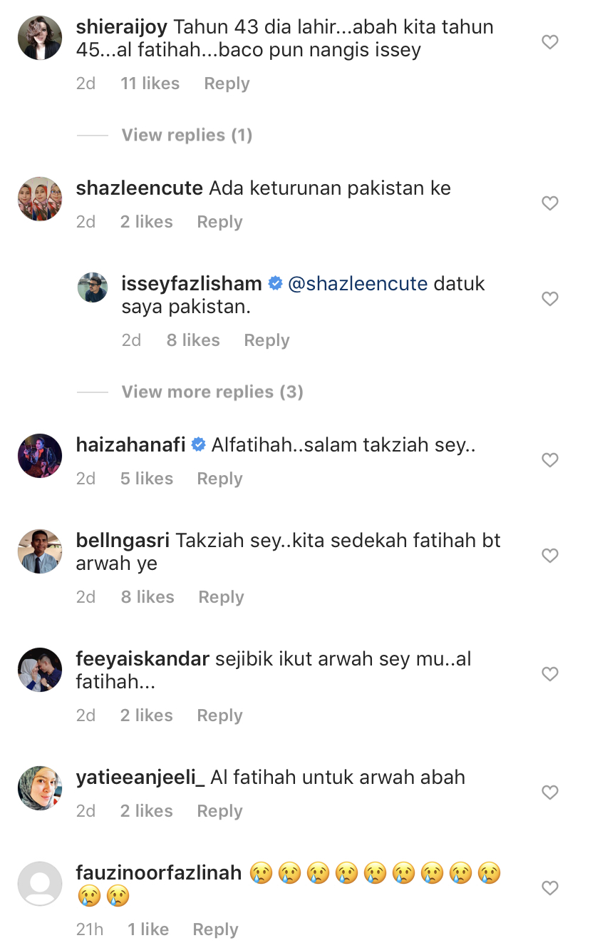 Menerusi ruangan komen, rata-rata pengikut Issey sedekahkan al-fatihah kepada arwah di samping turut berasa kehilangan.