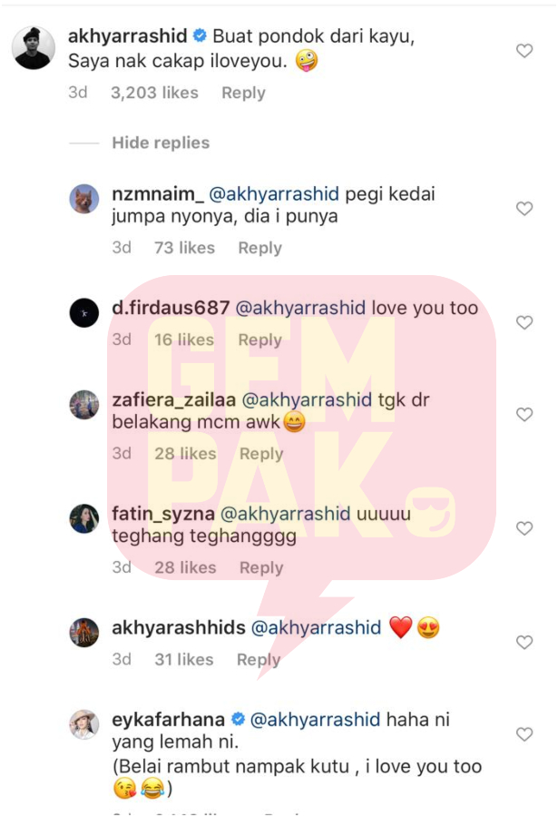 “Buat Pondok Dari Kayu, Saya Nak Cakap I Love You!” tulis Akhyar pada ruangan komen dan mendapat lebih 3200 tanda suka oleh pengikut IG kekasihnya itu.