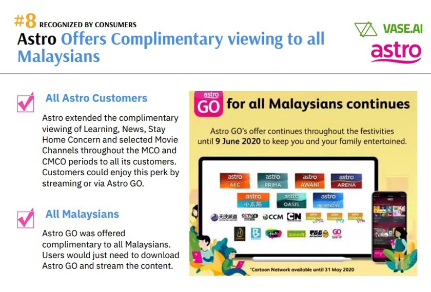 Sebuah firma teknologi terkemuka, Vase.ai menjalankan kaji selidik dalam kalangan 1,083 responden dan mendapati 10 jenama terkemuka negara, termasuklah Astro dihargai kerana usaha masing-masing dalam menyumbang kepada kebajikan rakyat ketika memerangi pandemik global.