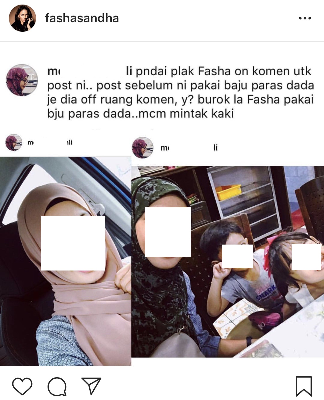 Pengguna tersebut meninggalkan komen negatif mempertikaikan mengenai tindakan Fasha menutup ruangan komen serta mendakwa Fasha kelihatan buruk apabila memakai baju paras dada.
