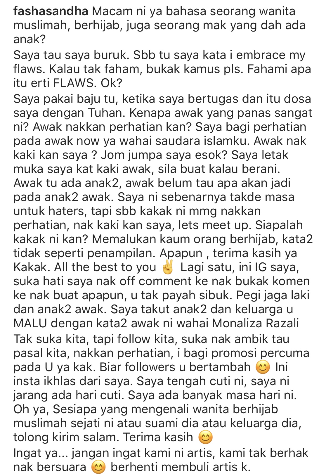 Merasakan dirinya dibuli, Fasha bertindak memberikan 'pengajaran' terhadap individu tersebut menerusi sebuah entri.
