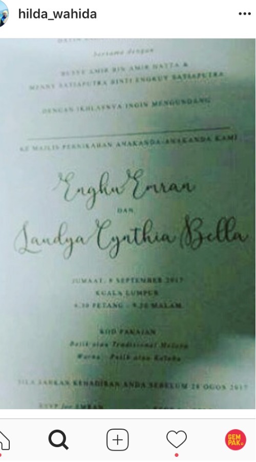 Kad jemputan perkahwinan pelakon Indonesia, Laudya Cynthia Bella dan bekas suami Erra Fazira, Engku Emran tersebar di media sosial.