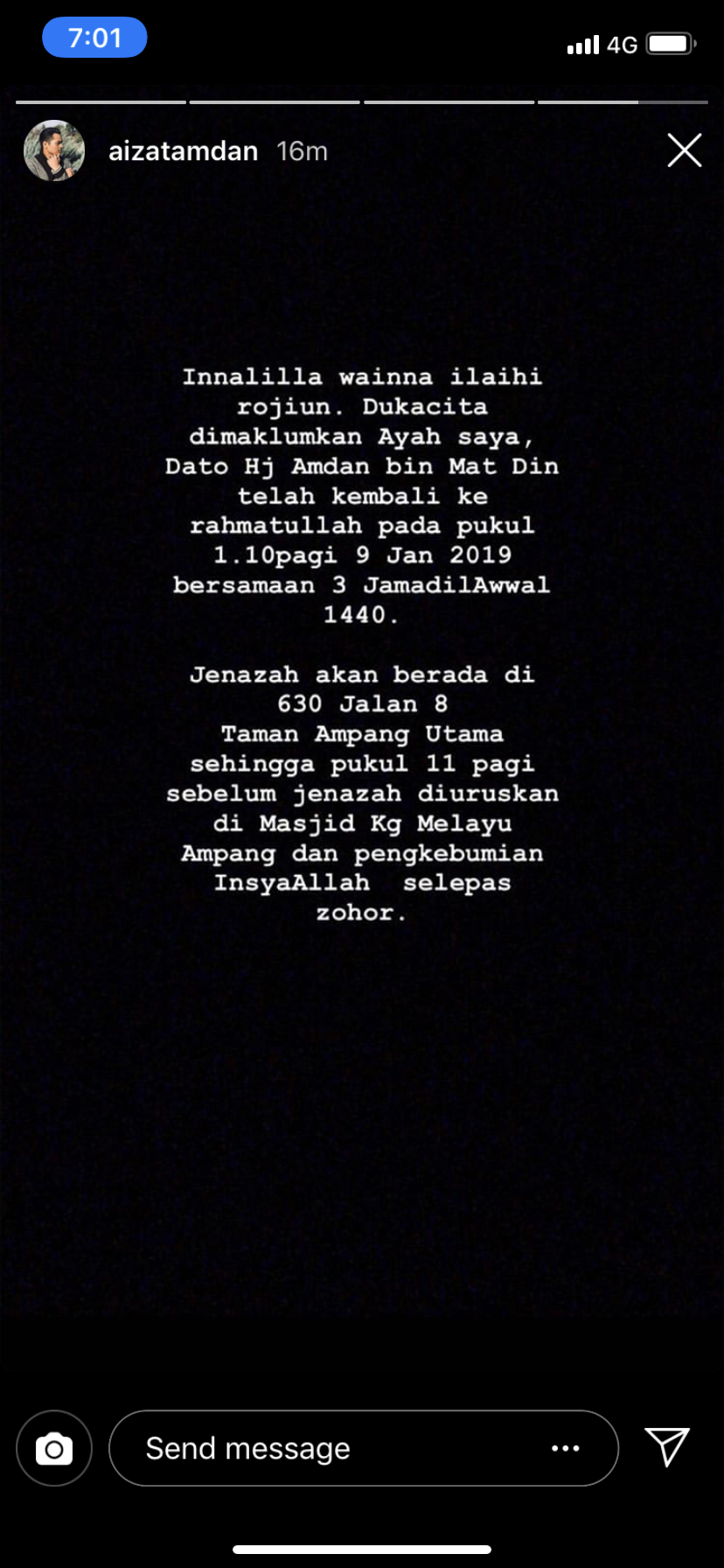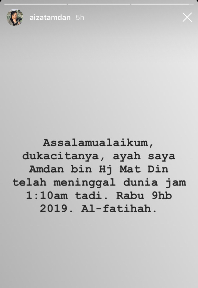 "Assalamualaikum, dukacitanya, ayah saya Amdan bin Hj Mat Din telah meninggal dunia jam 1:10 am tadi. Rabu 9hb 2019. Al-fatihah," tulisnya.