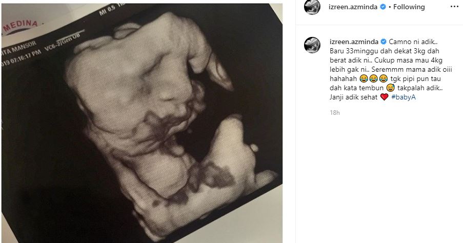 Menerusi entri di Instagram (IG), Izreen berkongsi foto imbasan ultrabunyi (ultrasound) yang merakamkan bentuk wajah anaknya.