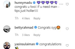Tidak ketinggalan, rakan artis juga turut meninggalkan komen dengan mengucapkan tahniah termasuklah Ismail Izzani, Betty Rahmad, Dynas Mokthar, Yasin Sulaiman dan Azira Shafinaz.