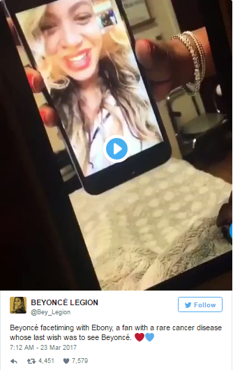 Impian pesakit kanser itu menjadi kenyataan selepas Beyonce menyedari tentang perkara tersebut dan membuat panggilan video.