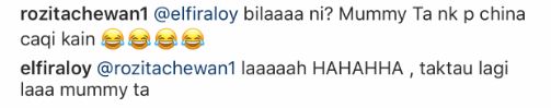 Rozita atau lebih mesra dengan panggilan Che Ta mendedahkan perkara tersebut menerusi ruangan komen entri terbaru Elfira di Instagramnya.