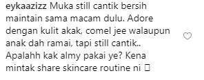 Rata-ratanya memberikan komen positif dan kata-kata semangat kepada Almy yang kini dalam proses mengurangkan berat badan selain memohon aktres itu berkongsi tips kecantikan wajahnya.