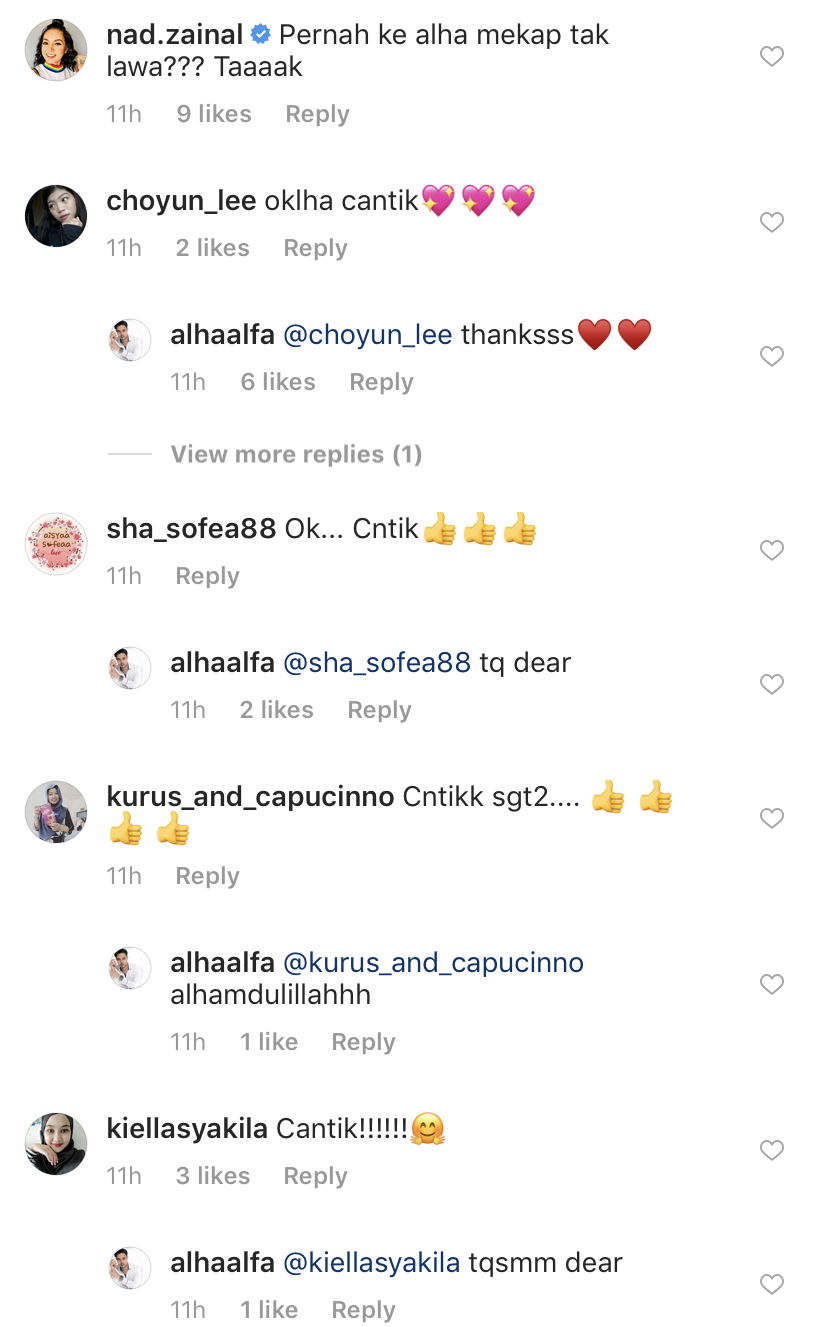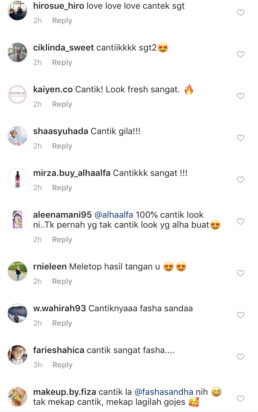 Rata-rata pengikut Alha memuji dengan kreativiti yang telah dicurahkan terhadap wajah Fasha malah berpuas hati dengan hasilnya.