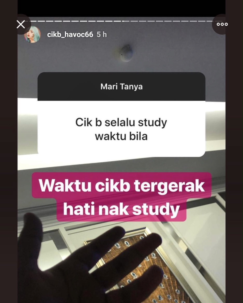 Seorang pengikut kemudian bertanya, “Cik B selalu study waktu bila?”
