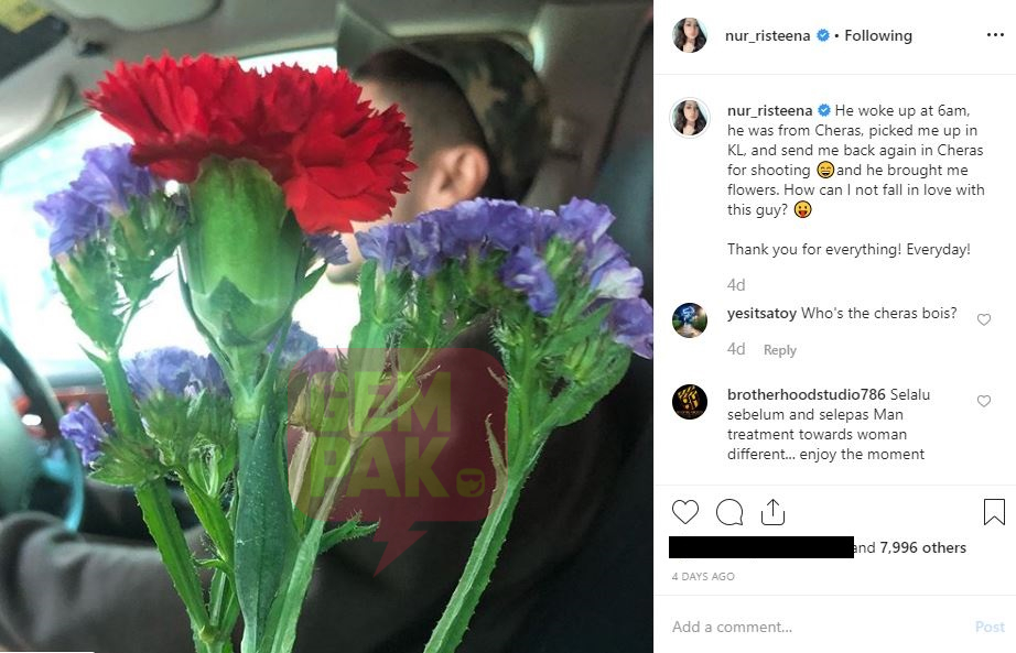 Azam juga memberikan Miss K foto seorang jejaka yang dikongsi di Instagram Risteena, tapi aktres itu menutup wajah jejaka terbabit dengan bunga.
