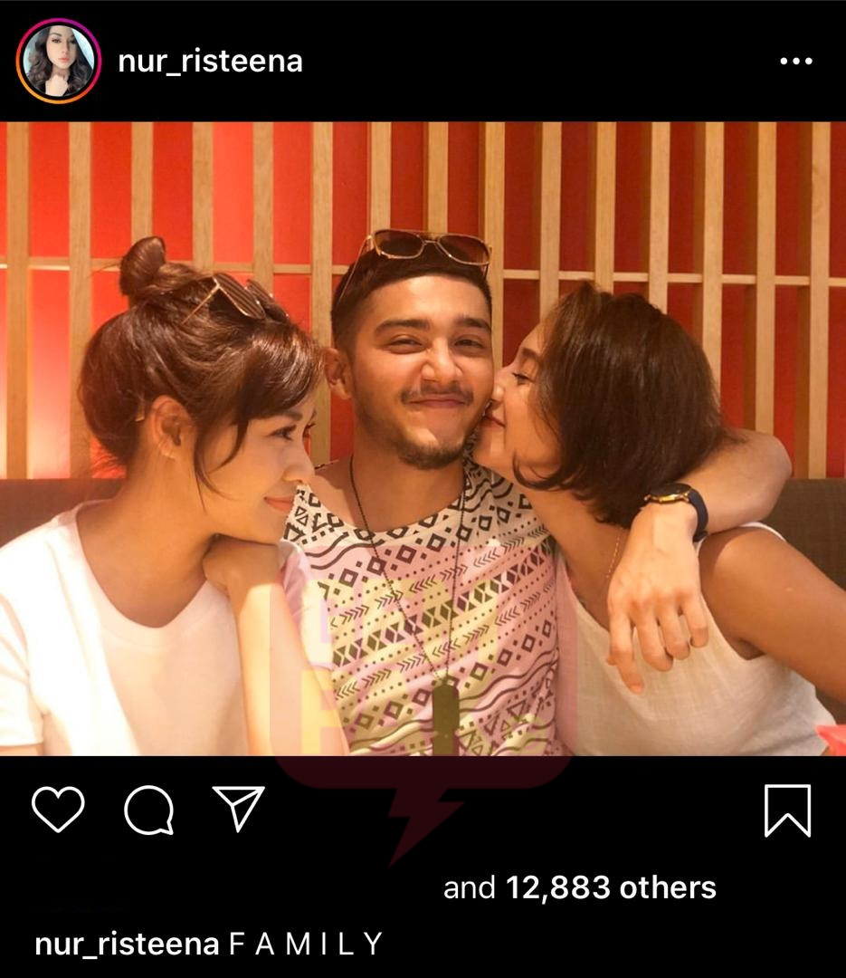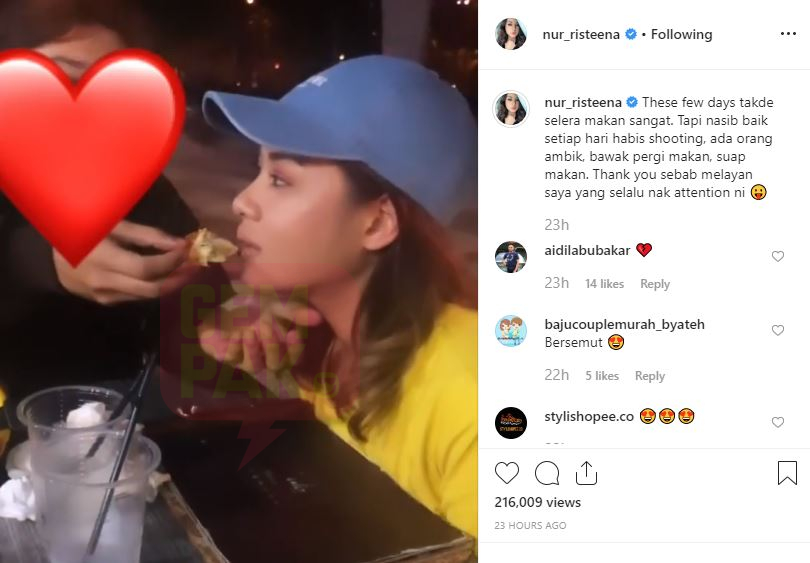 "Pelik ke tak pelik Miss K, sebab selama ni yang sorok wajah kekasih cuma adik dia, Ruhainies tu... Cover pakai emoji... Kali ni, kalau Miss K usha posting baru Instagram Risteena, dia up video ada jejaka suapkan dengan 'caption' berbunga. Eh, berlawan pulak adik beradik cover muka guna emoji.