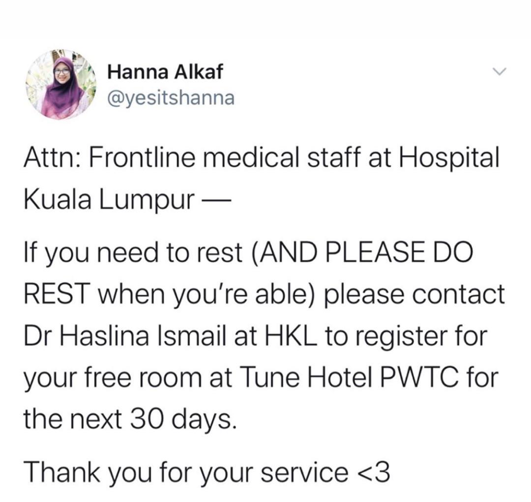 Difahamkan sebanyak 130 buah bilik di Tune Hotel PWTC, berhampiran HKL kini tersedia bersama hidangan sarapan pagi secara percuma buat semua kakitangan perubatan HKL bermula pada 24 Mac 2020 hingga 24 April 2020.