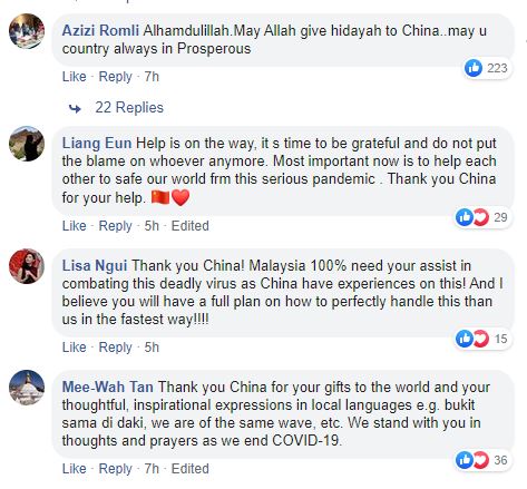 Menerusi laman sosial Facebook, Kedutaan China di Malaysia memuat naik lapan foto menunjukkan beberapa petugas sedang memasukkan kotak-kotak yang dipercayai mengandungi peralatan perubatan ke dalam lori untuk diedarkan.