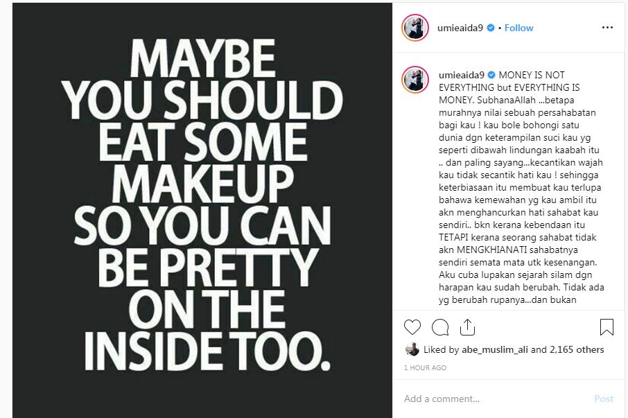 Biarpun tak menyebut sebarang nama, Umie nyata kecewa dengan perbuatan sahabatnya itu yang melukai hati dan perasaan Umie.