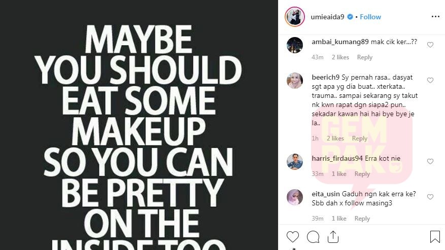 Ada yang mula meninggalkan komen dan mendakwa sahabat baik Umie, Erra Fazira sebagai individu yang dimaksudkan.