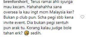 “Terus ramai ahli syurga mau kecam. Hahahahahha sana oversea la kau ingat macam Malaysia ker?Bukan pergi club pun. Scha pegi sebab kena invite event. Dia bukan pergi sentuh pun arak tu. Korang kalau judge bole tahan erk? Sedih,” tambah @brenforshort_ lagi.