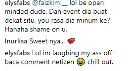 “Lol be open minded dude. Dah event dia buat dekat situ, you rasa dia minum ke? Hahaha shame on u,” tulis elysfabs.