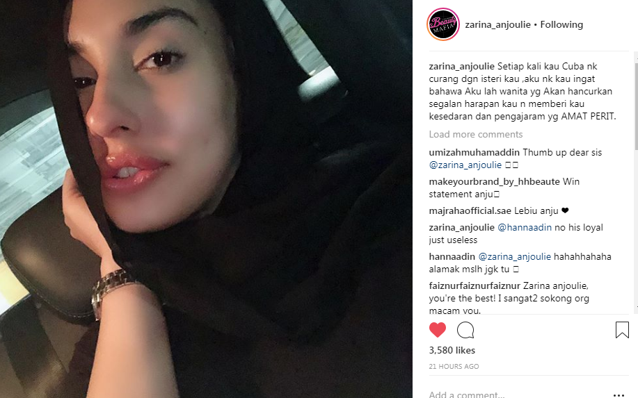 Seorang pengguna Instagram yang menggunakan nama @hannaadin bertanya Zarina sama ada bekas suaminya dahulu turut berlaku curang terhadapnya namun dia menafikan perkara itu.