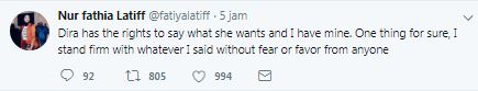 Fathia telah memuat naik posting di akaun media sosial Twitternya dan memberitahu jika Dira mempunyai hak untuk bersuara, begitu juga dia.