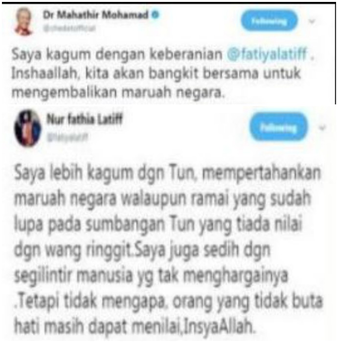 Posting tersebut telah mendapat reaksi Dr Mahathir yang kemudiannya membalas dan mengucapkan terima kasih kepada Fathia serta memuji keberanian pelakon tersebut.