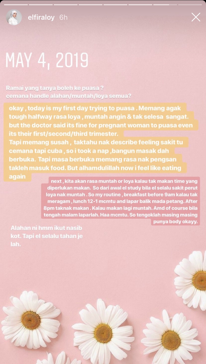 Menerusi Instagram Stories miliknya, Elfira akui pada mulanya agak susah dengan keadaan dirinya yang berasa loya, muntah angin dan tidak selesa.