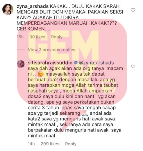 "Kakak. Dulu kakak Sarah mencari duit dengan memakai pakaian seksi kan? Adakah itu dikira memperdagangkan maruah kakak? Cuba komen," tanya netizen terbabit.