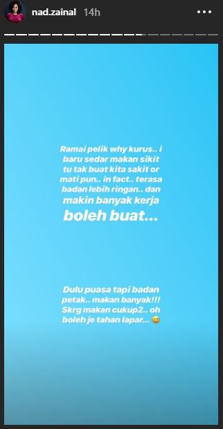“Ramai pelik why kurus… I baru sedar makan sikit tu tak buat kita sakit or mati pun. In fact, terasa badan lebih ringan dan makin banyak kerja boleh buat.