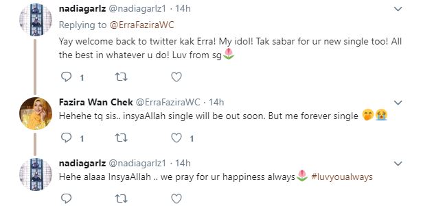 Bagaimanapun Erra sempat berseloroh dan menjawab single terbarunya akan keluar tidak lama lagi tetapi dirinya akan tetap ‘single’ selama-lamanya yang disertakan dengan emoji menangis.