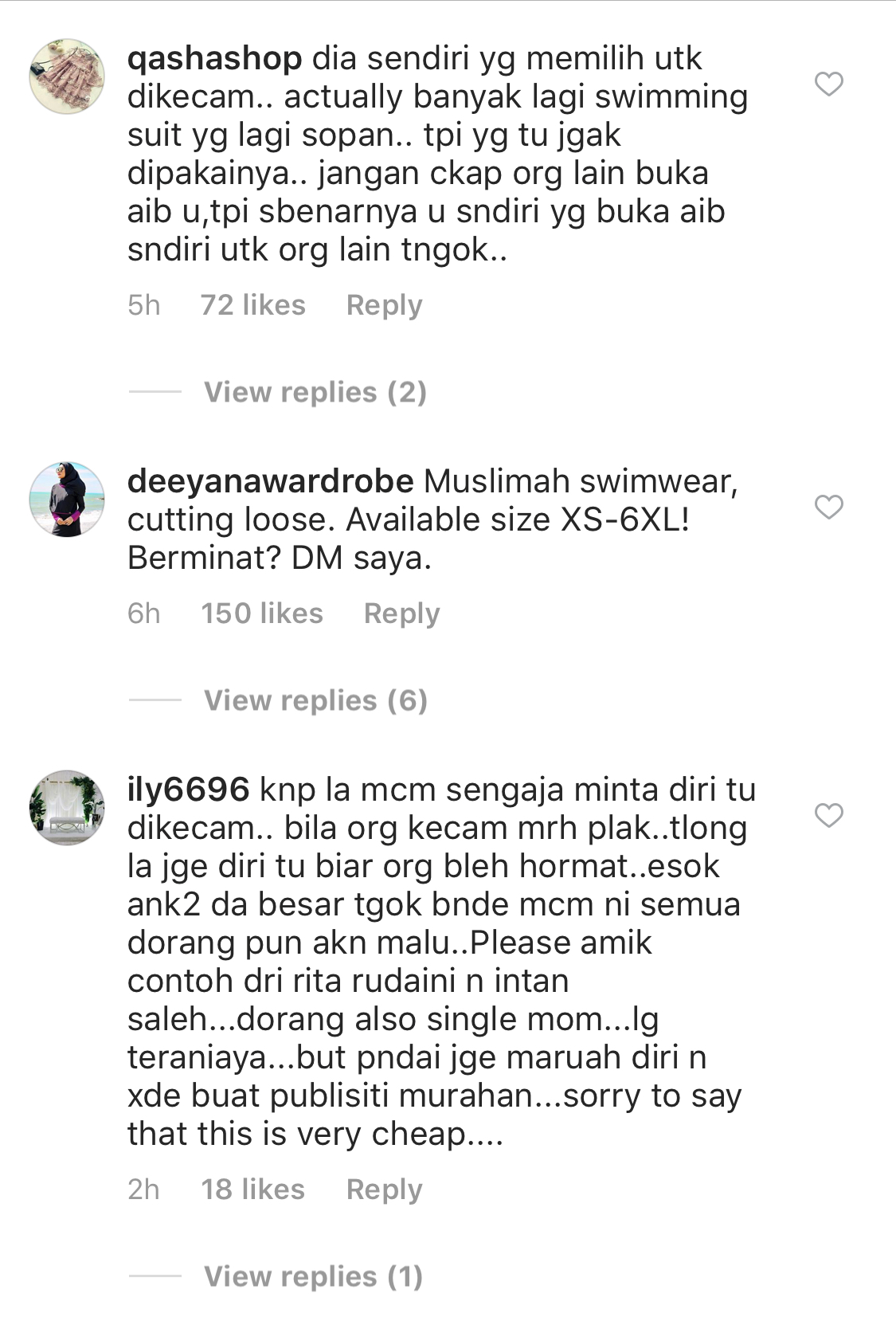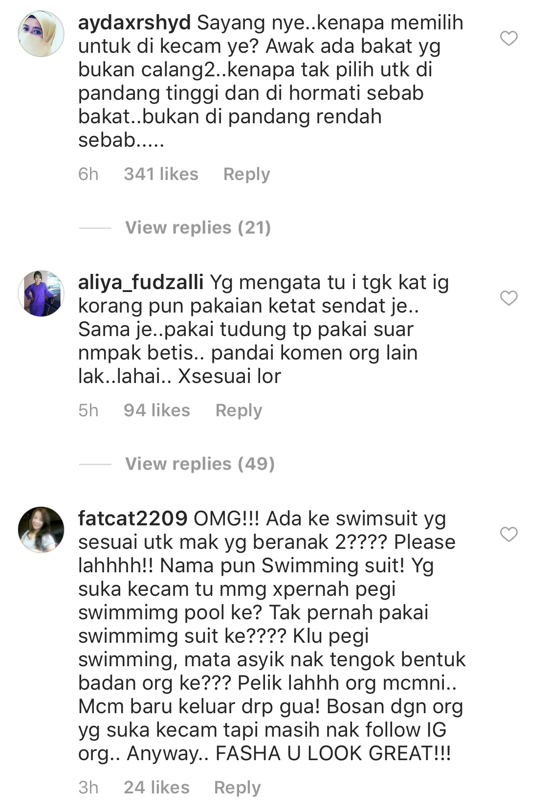 Di ruangan komen, rata-rata netizen memberi kecaman dan menyifatkan pakaian renang yang digayakan Fasha agak mencolok mata.