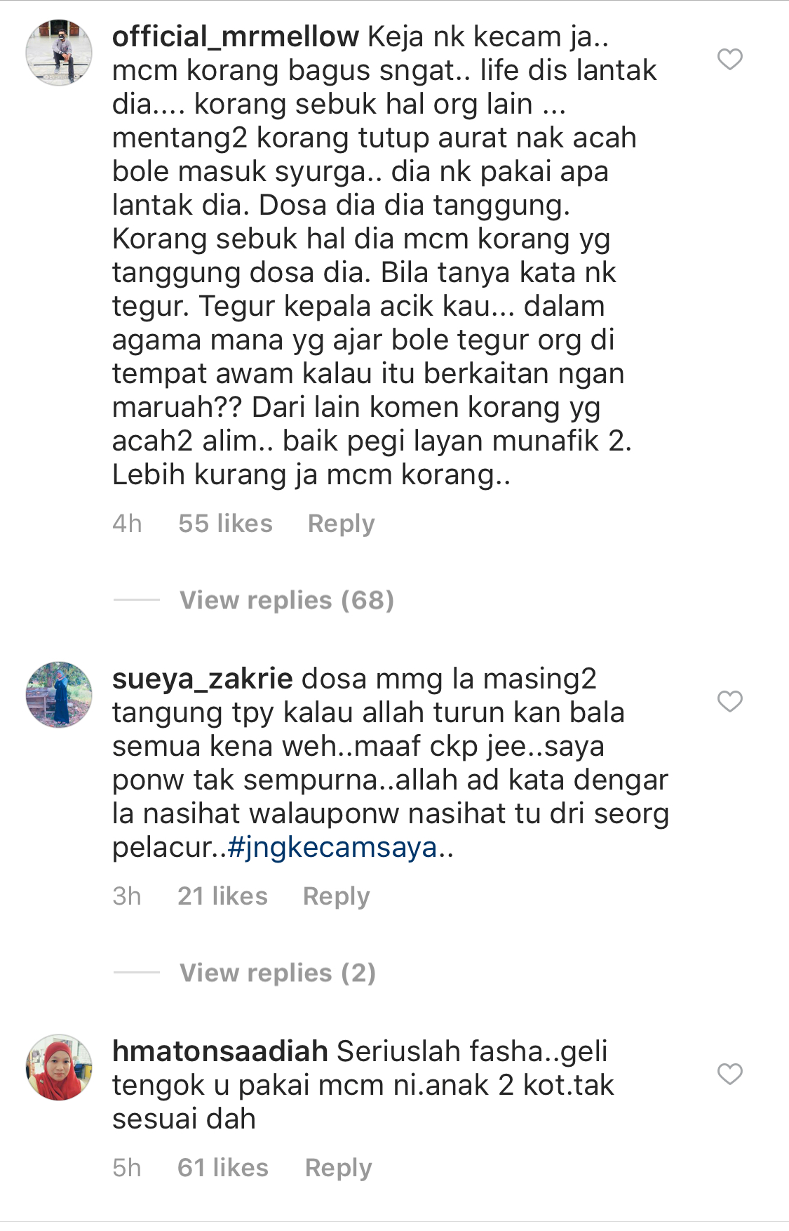 Namun begitu, Fasha memilih untuk berdiam diri dan tidak membalas komen-komen berbentuk kecaman tersebut.