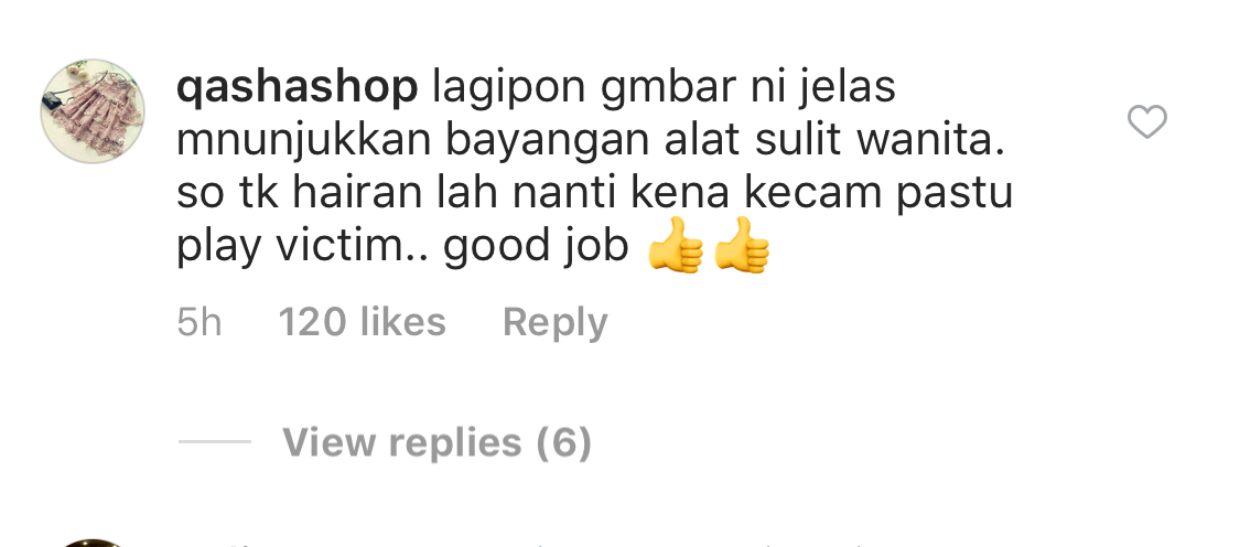 "Gambar ini jelas menunjukkan bayangan alat sulit wanita, tak hairan lah nanti kena kecam lepas tu 'play victim," tulis beberapa netizen.