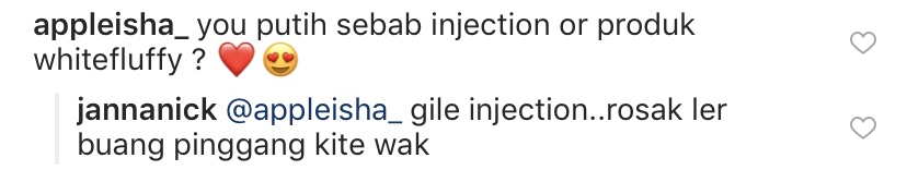 Namun, apa yang lebih menarik ialah kelihatan seorang peminat bertanya sama ada wajahnya yang putih itu disebabkan suntikan ataupun produk pencuci muka.