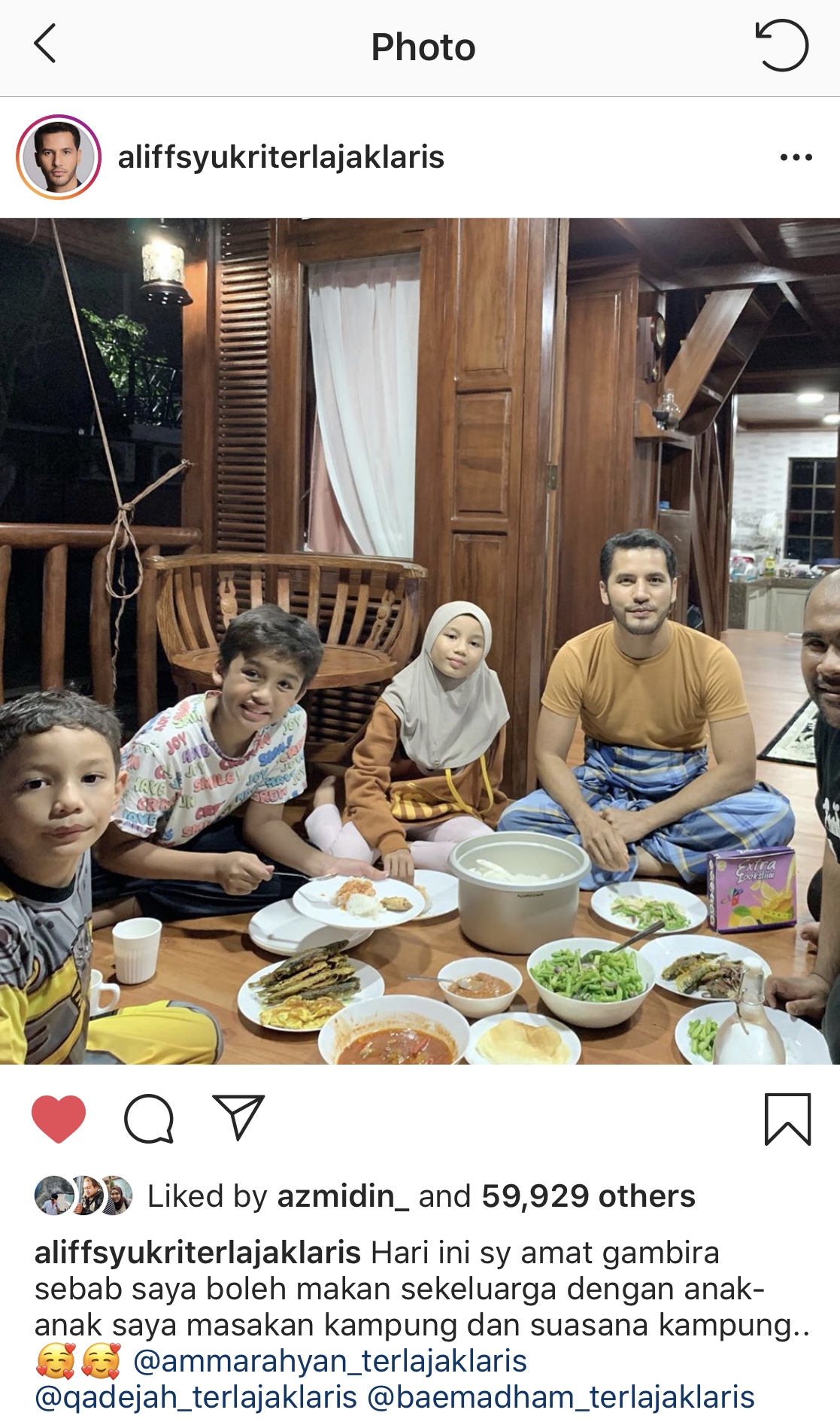 "Hari ini saya gembira sebab saya boleh makan sekeluarga dengan anak-anak saya, masakan kampung dan suasana kampung," tulis Aliff di ruangan kapsyen.