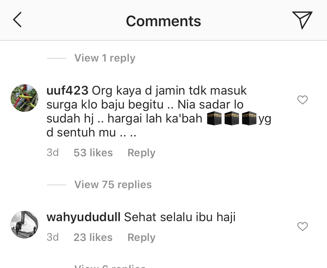 "Orang kaya dijamin tak masuk syurga kalau baju begitu, Nia sedar kamu sudah mengerjakan Haji, hargailah kaabah yang disentuhmu.
