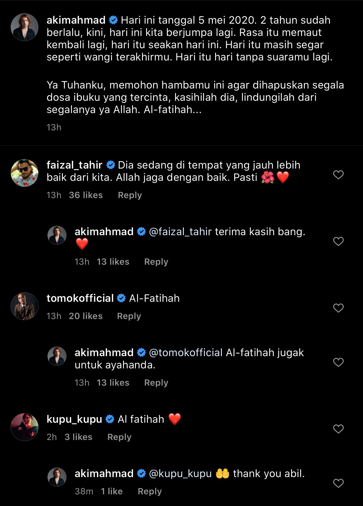 Dalam pada itu menerusi ruangan komen, rakan selebriti juga turut memanjatkan doa kepada arwah ibu kesayangan Akim.
