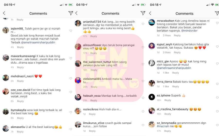 Menerusi pemerhatian Gempak di ruangan komen laman sosial Instagram Amelina, gaya lakonan bersahaja dalam membawakan watak Maznah mendapat respon positif netizen.