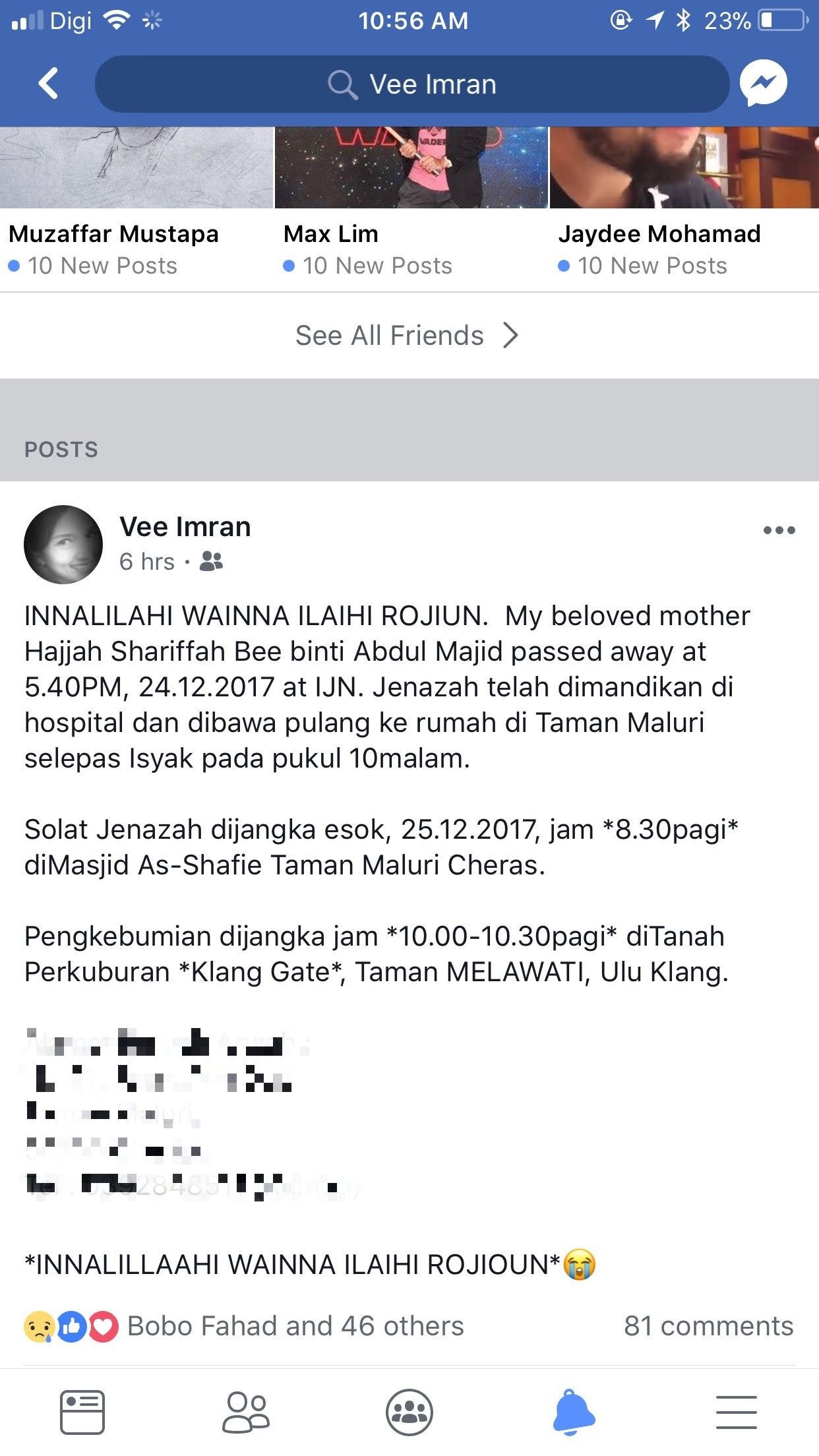 Menerusi perkongsian tersebut, Vee memberitahu jenazah Allahyarhamah ibunya telah dimandikan di hospital dan dibawa pulang ke kediamannya di Taman Maluri pukul 10 malam.