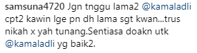 "Jangan tunggu lama-lama Kamal, cepat-cepat kahwin lagipun dah lama kawan. Terus nikah tak payah tunang," tulis @samsuna4720.