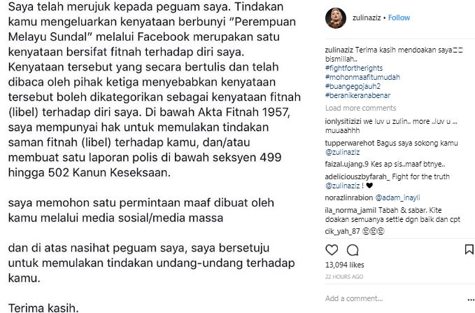 Zulin sebelum itu, memuat naik entri di FB dan Instagram (IG) meminta Dura Hatta tersebut meminta maaf sebelum dia mengenakan tindakan mahkamah terhadap pengguna laman sosial tersebut.