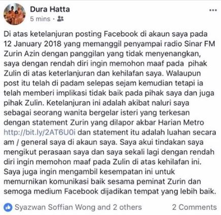 Individu yang menggunakan nama Dura Hatta di laman sosial Facebook (FB), telah membuat permohonan maaf secara terbuka kepada penyampai radio dan pengacara Zulin Aziz.