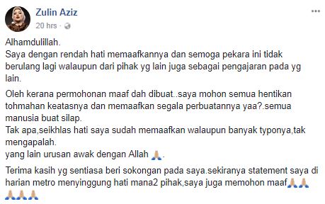 "Dengan rendah hati saya memaafkan segala apa yg dia kata pada saya.sedangkan nabi maafkan umat apatahlagi saya manusia biasa.. Semoga dapat jadi pengajaran pada yang lain.