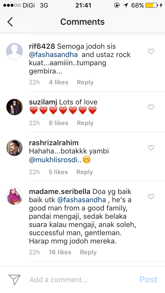 "Doa yang baik-baik, dia seorang lelaki yang baik daripada keluarga yang baik, pandai mengaji, anak soleh dan berjaya. Harap memang jodoh mereka," tulis @madame.seribella.