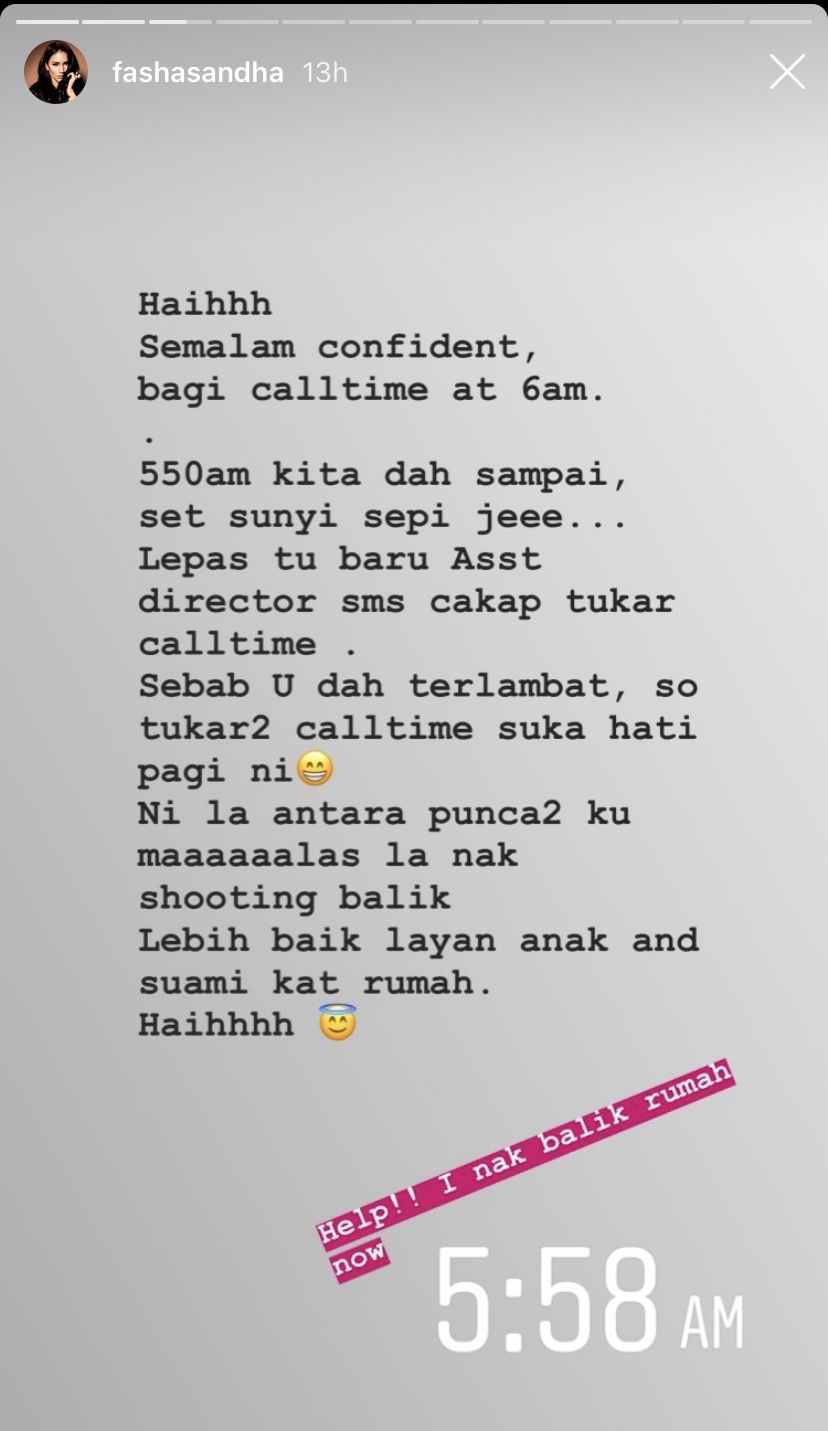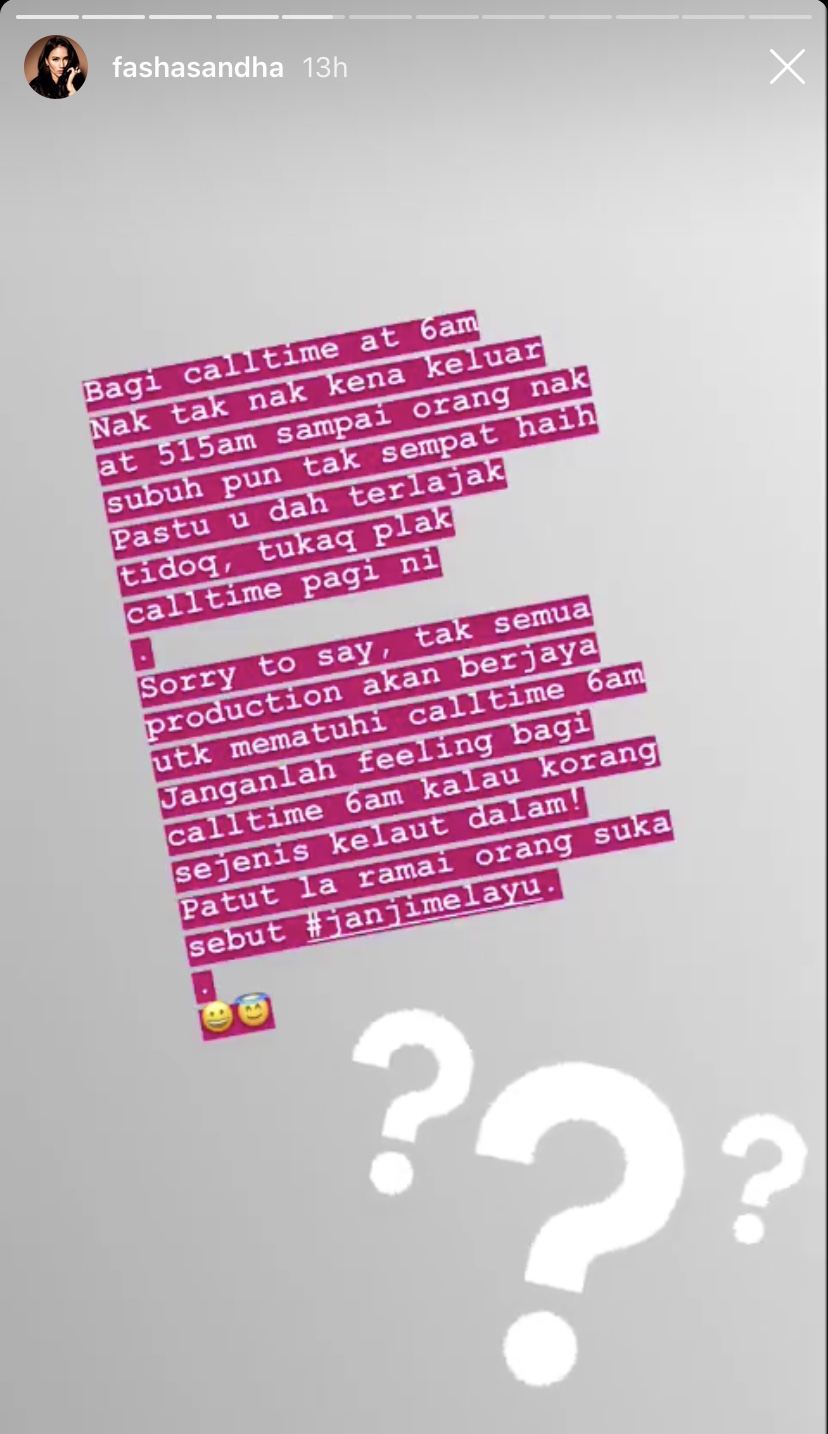 Pelakon Fasha Sandha berang apabila terdapat sebuah produksi yang mengubah 'calltime' pada saat akhir.