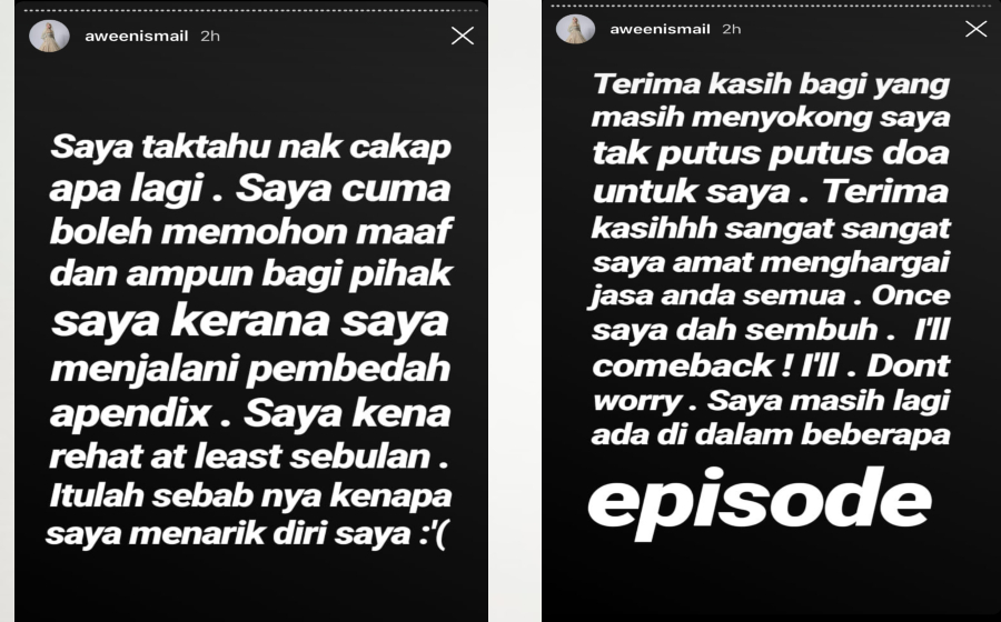 Menerusi kemas kini ruangan Instagram Stories miliknya, Aween menceritakan yang dia kini menghadapi masalah kesihatan dan terpaksa menjalani pembedahan serta perlukan masa untuk pulih seperti biasa.