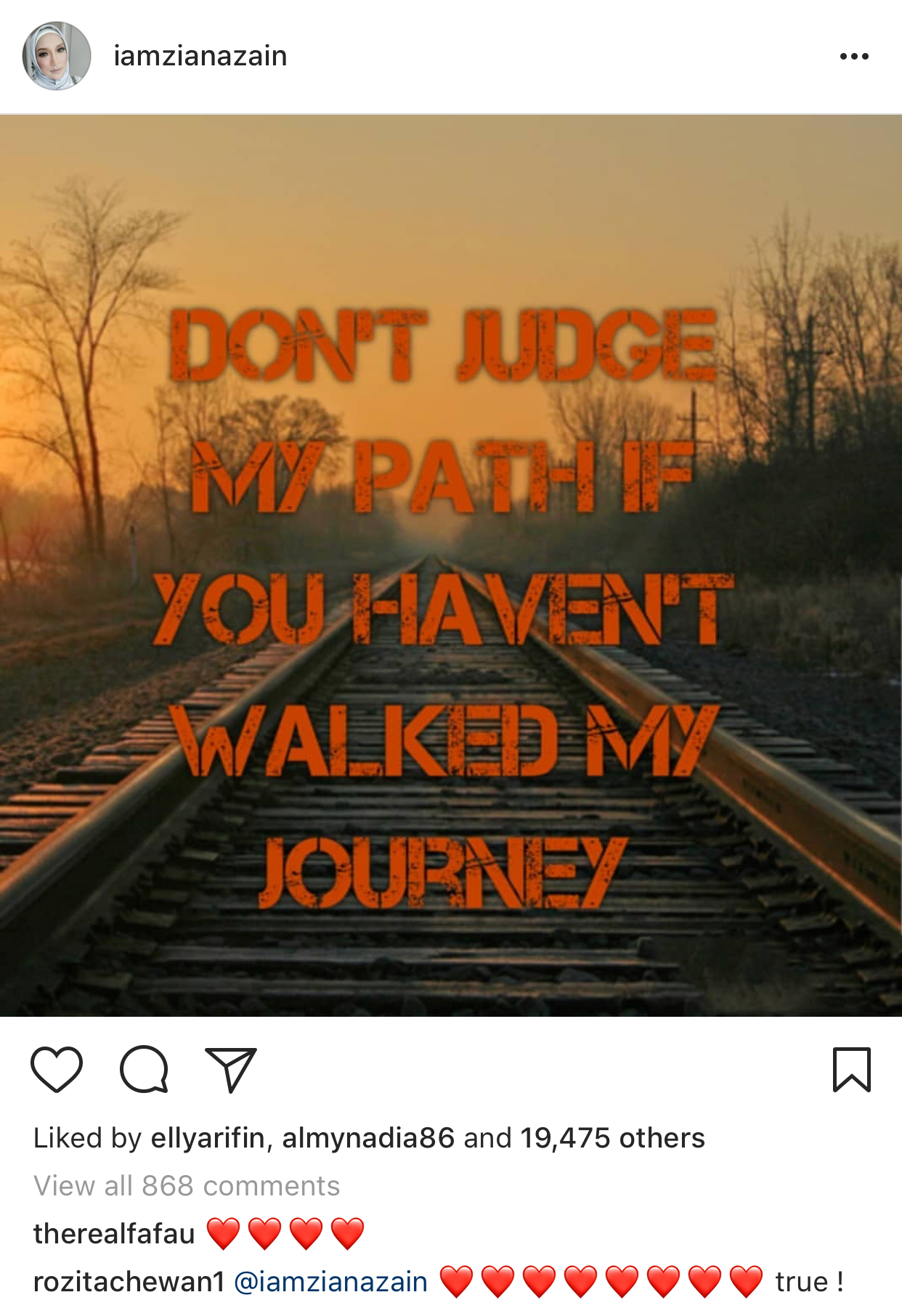 Ziana telah memuat naik satu foto berbentuk tulisan berlatarkan pemandangan di laluan kereta api menerusi akaun Instagramnya hari ini.